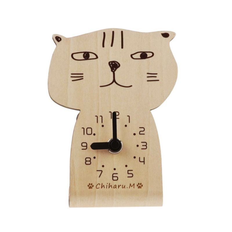 小ぶりで場所を選ばず飾れる置時計です。 愛らしい絶妙な表情が猫好きにはたまらない! ユニークさが愛しく、見ているだけでついつい笑顔になっちゃう♪ 木製で優しい素材がどんなお部屋にもなじみます。