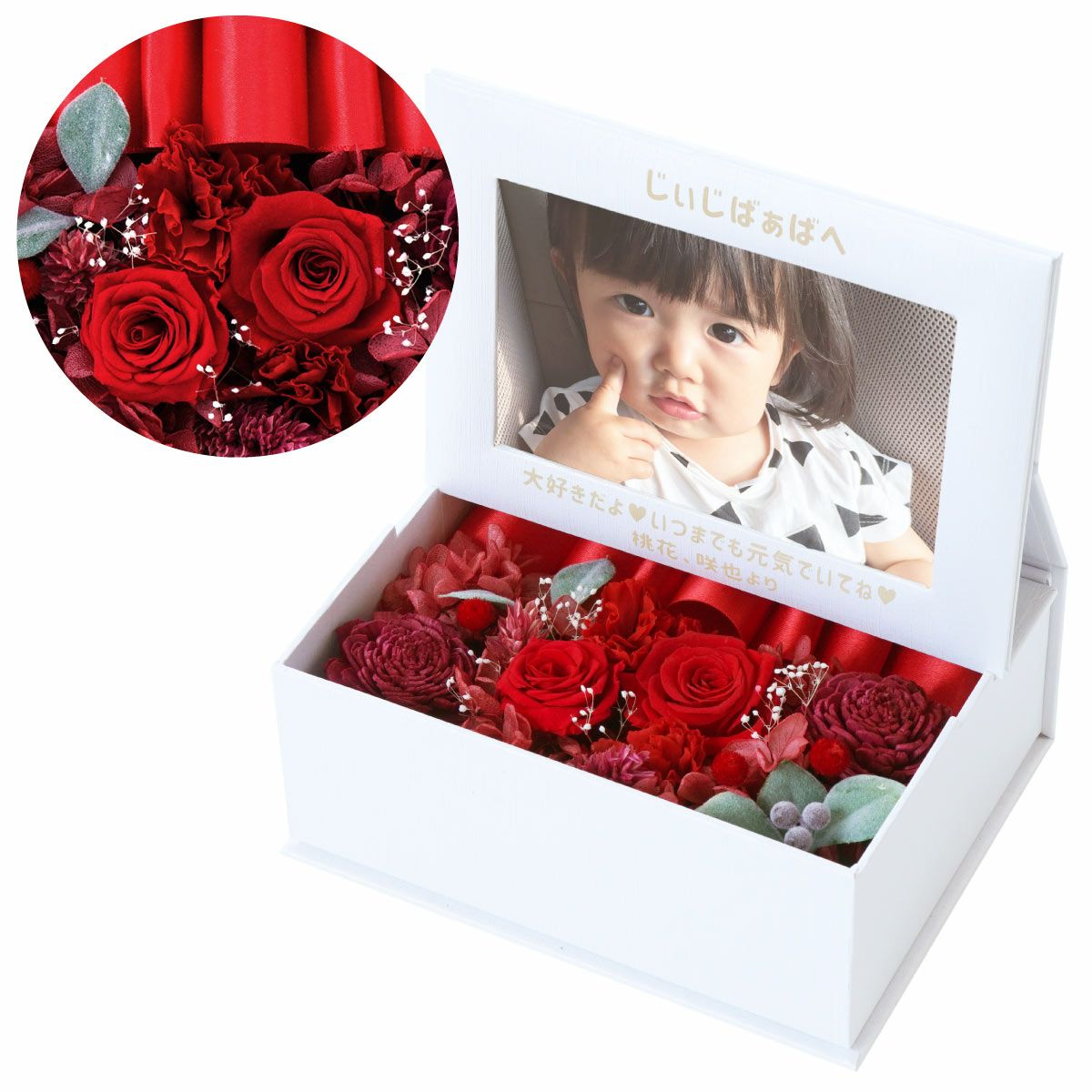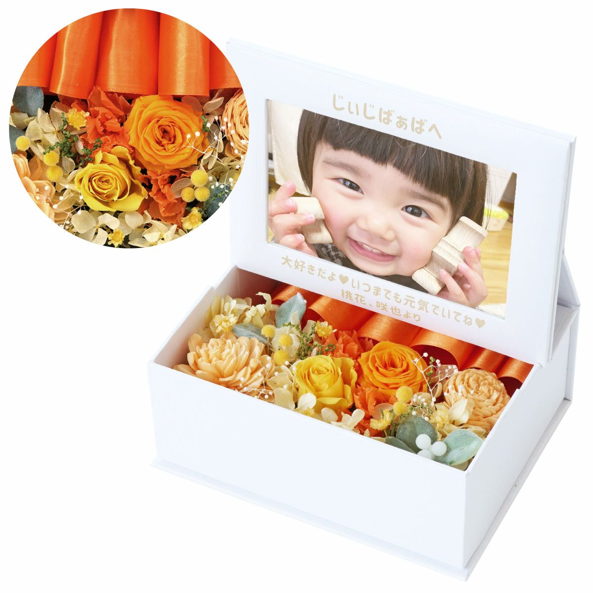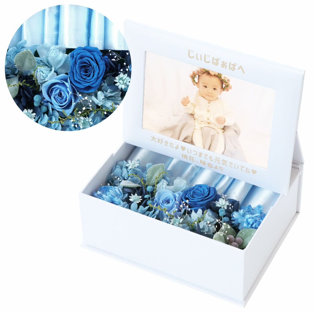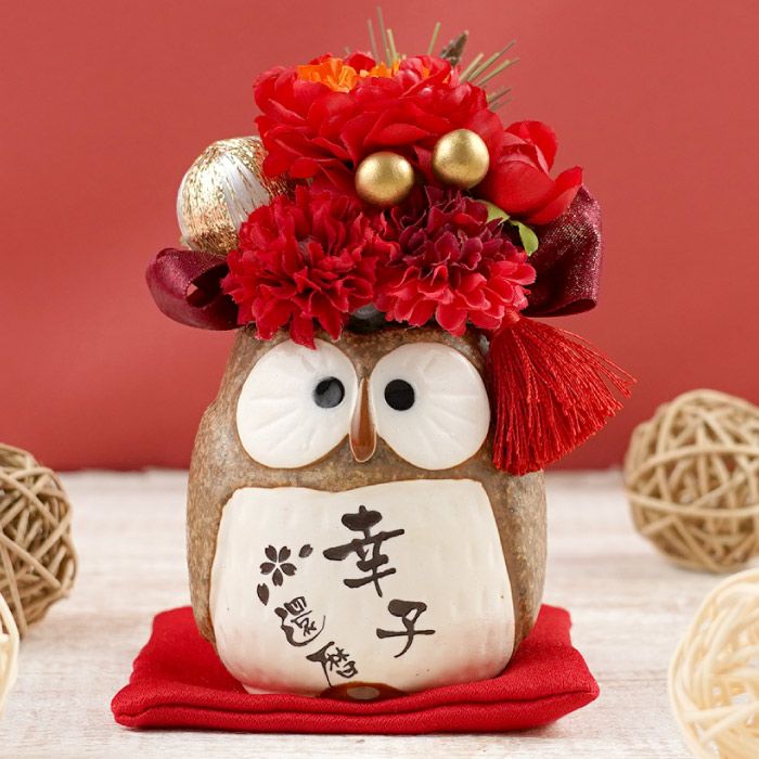 ぽってりペアのふくろうと華やかなプリザにメッセージ入り立札 名入れ ぽってりふくろうプリザ ペア