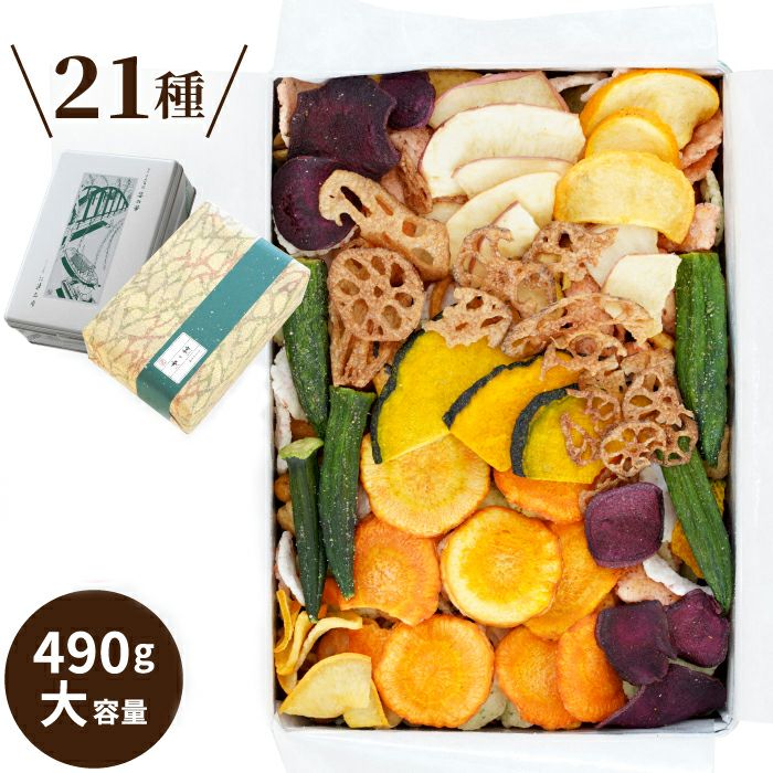 蓮根、かぼちゃ、人参、柿、りんご、オクラ、紫芋などの野菜チップス・果物チップス、10種類以上のおかき、おせんべい、豆菓子等こだわりの素材を贅沢に詰め合わせた吹寄せ菓子「宴の華」。 味一筋に打ち込む職人達が生み出した自信作、全21種を贅沢に味わえます。 当店の看板商品で、各界の著名人からご愛顧頂いている商品でございます。目に映る楽しさと美味しさで、一つまみ一つまみ違った味と食感が楽しめます。 「宴の華 小缶」は上品な缶に丁寧にパッケージングしております。お中元、お歳暮、手土産、等の贈答品のお菓子に最適です。 ※原材料の野菜は季節により変更がある場合がございます。 また収穫期によって野菜の種類が減る事もございますので予めご了承くださいませ。 ◆商品への思い 逸品会が店舗を構える東京柳橋の花柳界(かりゅうかい)を表現したこだわりのお菓子です。 花柳界とは、芸を売る芸者さんたちが活動する界隈のことを言います。 柳橋の花柳界で働く一流の芸者さんたちの華やかさ、その裏にある様々な苦労、仕事人としてのこだわり。 そんな花柳界の世界を、厳選した21種類の素材で表現したのが宴の華なのです。 ◆繊細なパッケージング 野菜チップス、果物チップスなど形の綺麗なものを選定し、壊れないように一つひとつ丁寧に手作業で詰めております。 見た目も映える華やかなパッケージングはお土産に喜ばれる事間違いなしです。 ◆減圧フライ製法 低温かつ少量の油と短い上げ時間に抑えられる減圧フライによって、素材本来の色彩をしっかりと残し旨味を閉じ込めております。 ビタミン、ミネラルなどの栄養素も壊さず保持でき体に優しいお菓子です。 サクサクと食べやすい食感で、おつまみにもなるのでホームパーティーの手みやげににも。