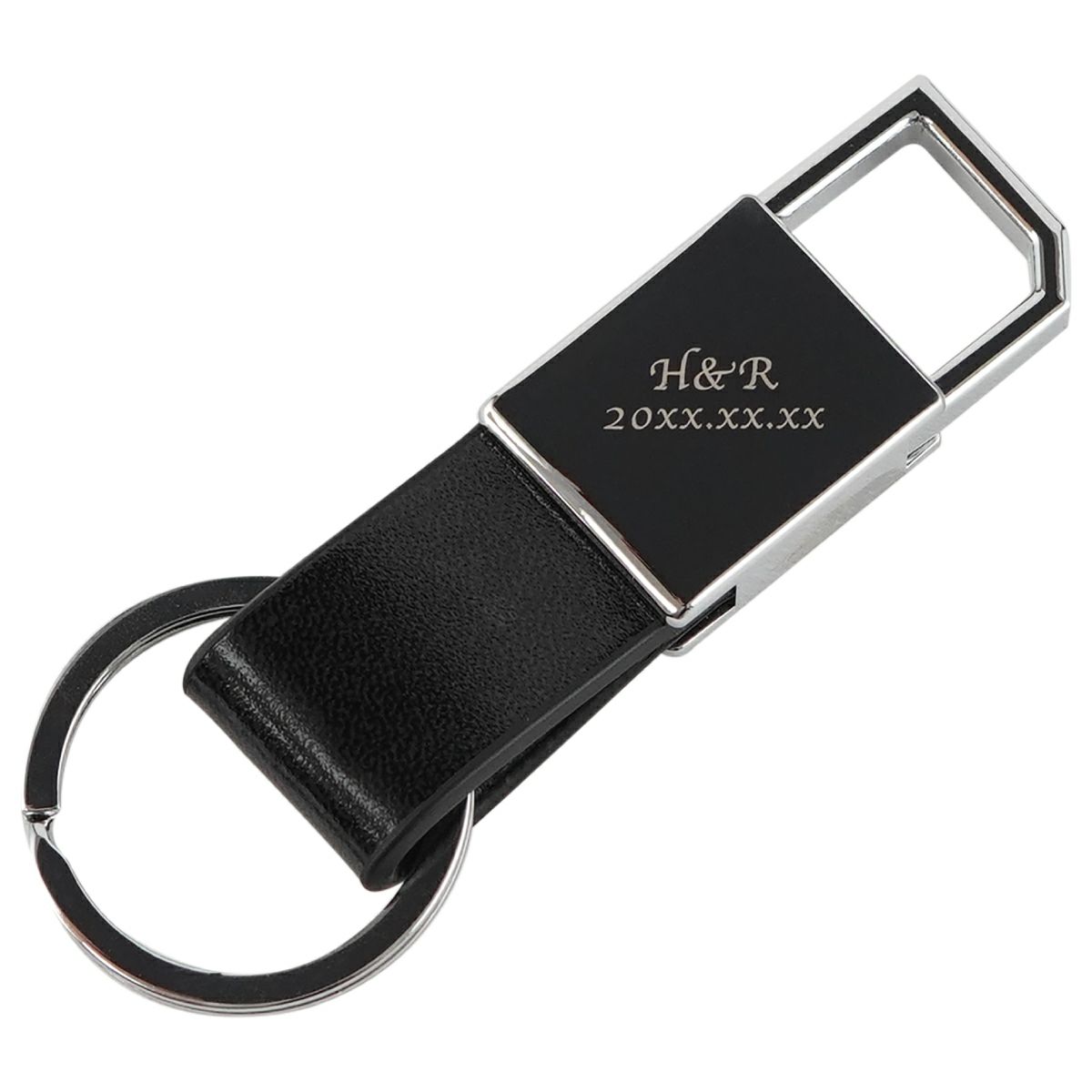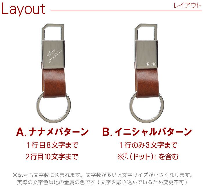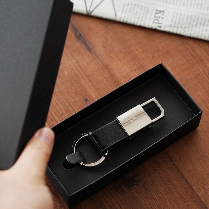 大人のためのキーホルダー グロッシーな金具部分に金属彫刻でお名前や記念日の日付を彫刻します。派手すぎず落ち着いたデザインだから、大人な彼にぴったり!レザー部分はしっかりとした牛本革で上品さをプラス。