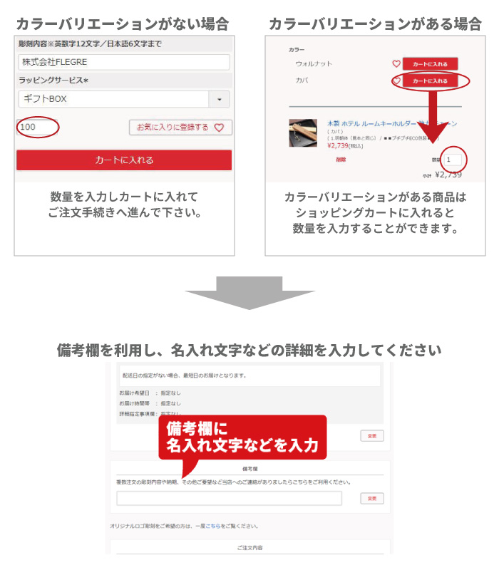 ご注文手続きページの「備考欄」にご記載下さい。