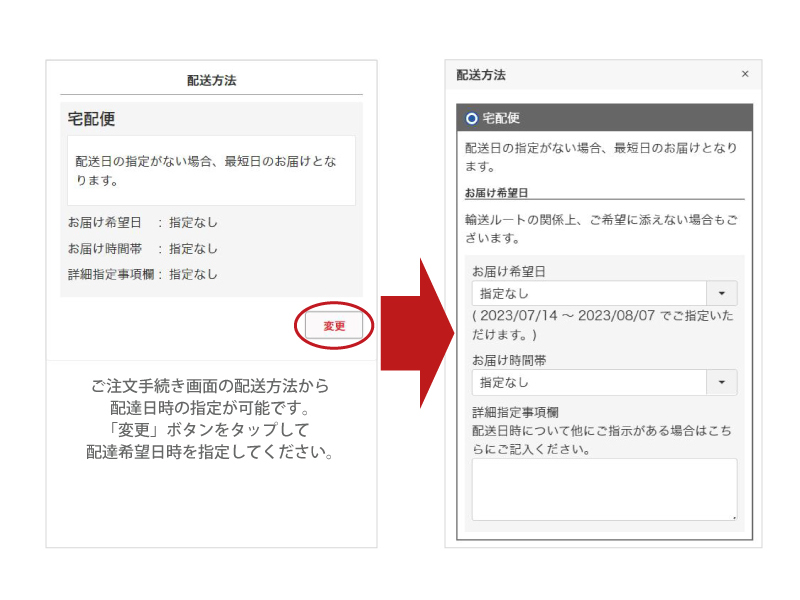 A. ご注文手続き時、配送方法からお届け希望日・お届け時間帯を指定できます。