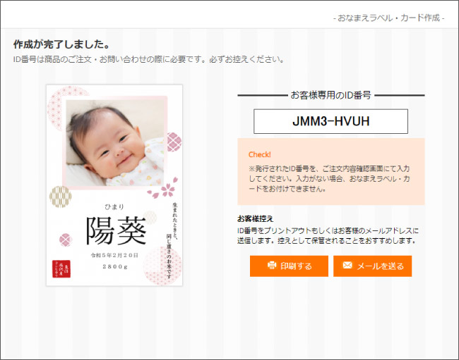 ご注文内容確認画面にて、作成したおなまえラベル・カードのID番号に誤りがないか確認して、ご購入ください。