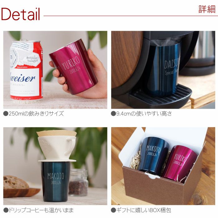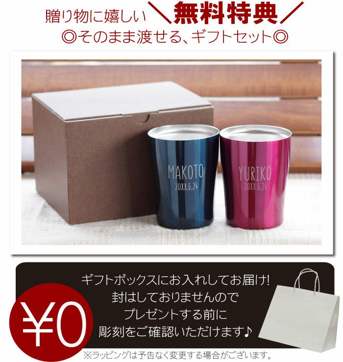 他の画像を見る 送料無料 ご両親へのお祝いに!しっかり彫刻タンブラー+そのまま渡せるギフトセット 名入れ真空断熱タンブラー 250ml 松梅ペアセット ¥ 6,980 税込 詳細を見る お気に入りに登録する
